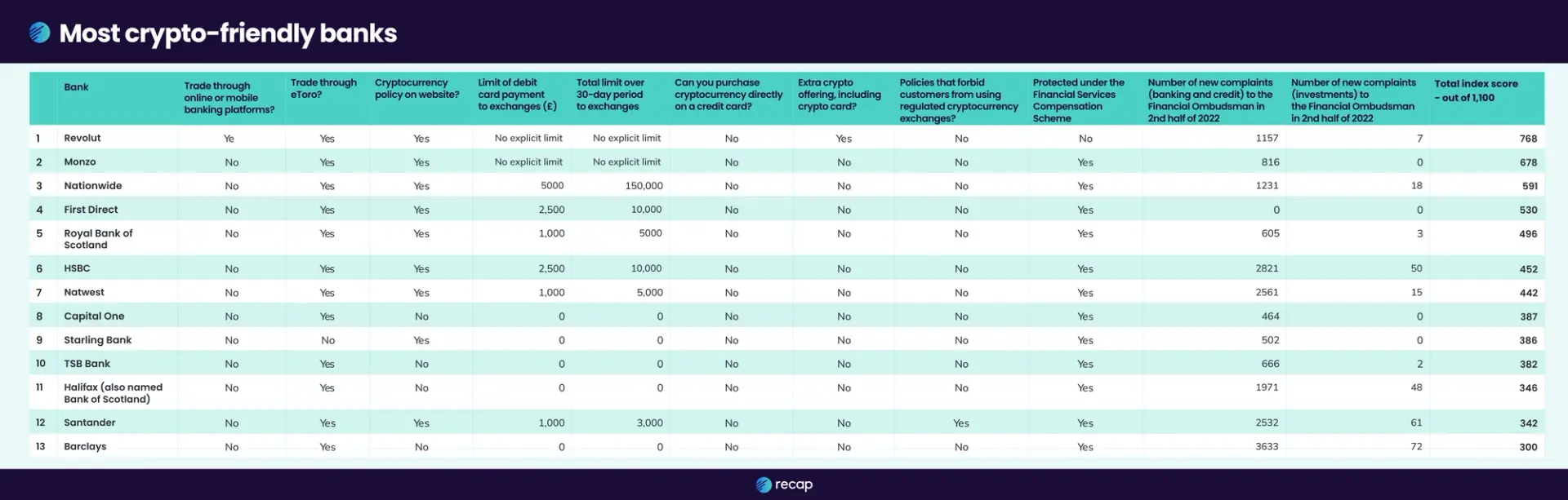 To find out, Recap created the crypto-friendly banks index. We looked at 13 of the biggest banks across the UK and analysed 12 different data points.